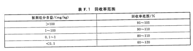 對于食品中的禁用物質,回收率應在方法測定低限、兩倍方法測定低限和十倍方法測定低限進行三水平試驗;對于已制定最高殘留限量(MRL)的,回收率應在方法測定低限、MRL、選一合適點進行三水平試驗;對于未制定MRL的,回收率應在方法測定低限、常見限量指標、選一合適點進行三水平試驗。回收率的參考范圍見表F.1.
