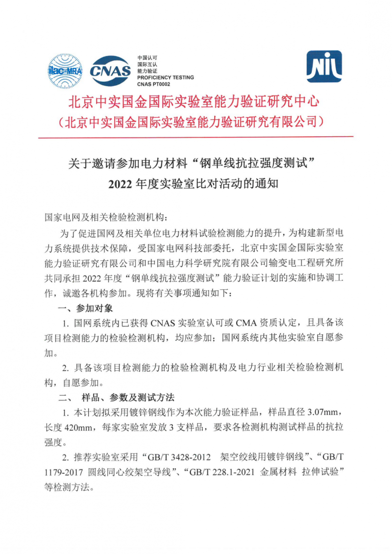 通知 | 關于邀請參加電力材料“鋼單線抗拉強度測試” 2022年度實驗室比對活動的通知