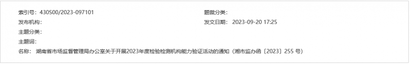 核心提示:湖南省市場監督管理局辦公室關于開展2023年度檢驗檢測機構能力驗證活動的通知(湘市監辦函〔2023〕255 號).pdf